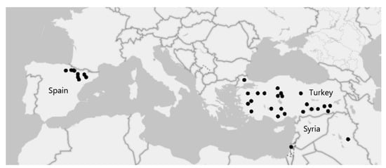Map showing the location of the 57 Brachypodium distachyon accessions used in this research.