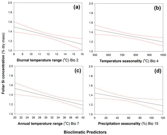 Significant negative correlations between leaf Si concentrations and (a) annual mean diurnal temperature range, (b) temperature seasonality, (c) annual temperature range, and (d) precipitation seasonality. N = 247. Regression line (solid line) fitted with 95% confidence displayed as dashed lines. See Table 1 for statistical analysis.