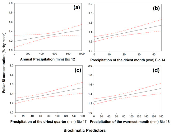 Significant positive correlations between leaf Si concentrations and (a) annual precipitation, (b) precipitation of the driest month, (c) precipitation of the driest quarter, and (d) precipitation of the warmest month. N = 247. Regression line (solid line) fitted with 95% confidence displayed as dashed lines. See Table 1 for statistical analysis.