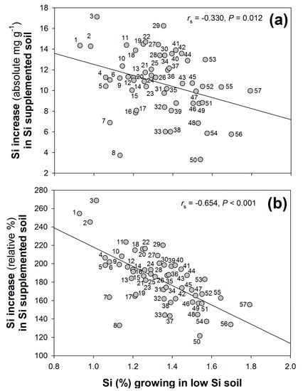 Plants grown in high-Si soil had significantly higher concentrations of leaf Si compared with those grown in low-Si (2.41% ± 0.04 and 1.32% ± 0.02, respectively, mean ± standard error given) (H1 = 320.2, p < 0.001). There was, however, a significant negative correlation between this increase in Si concentrations, either in terms of absolute (Figure 4a) or percentage (Figure 4b) increase, and the Si concentrations observed when growing in low- (untreated) Si soil. In other words, accessions achieving relatively greater Si accumulation under low-Si conditions tended to show comparatively smaller increases in Si when the soil was supplemented with Si.