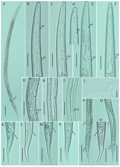 Photomicrographs of female Ditylenchus anchilisposomus (Tarjan) Fortuner [28,40] (A) Entire body; (B–F) pharyngeal regions; (G–I) vulval regions; (J) lateral field lines; (K–O) tail regions; (P,Q) posterior body to tail terminus. Scale bars: (A,P,Q) 50 μm; (B–I,K–O) 20 μm; (J) 5 μm. Arrows: (a) anus; (exp) secretory–excretory pore; (mb) median bulb; (PUS) postvulval uterine sac; (v) vulva.