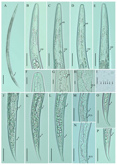 Photomicrographs of female Ditylenchus clarus Thorne and Malek [31] (A) Entire body; (B–E) pharyngeal regions; (F) lip region; (G) median bulb; (H,M,N) vulval regions; (I) lateral field lines; (J–L) posterior body to tail terminus; (O,P) tail regions. Scale bars: (A) 50 μm; (B–E,J–P) 20 μm; (F–I) 5 μm. Arrows: (a) anus; (exp) secretory–excretory pore; (mb) median bulb; (PUS) postvulval uterine sac; (v) vulva.