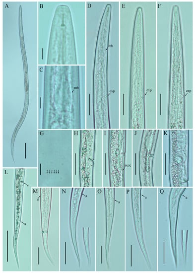 Photomicrographs of female Ditylenchus tenuidens Gritsenko [41] (A) Entire body; (B) lip region; (C) median bulb; (D–F) pharyngeal regions; (G) lateral field lines; (H–K) vulval regions; (L) posterior body to tail terminus; (M–Q) tail regions. Scale bars: (A,L) 50 μm; (B,C,G) 5 μm; (D–F,H–K,M–Q) 20 μm. Arrows: (a) anus; (exp) secretory–excretory pore; (mb) median bulb; (PUS) postvulval uterine sac; (v) vulva.