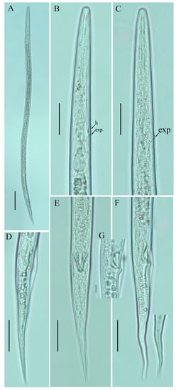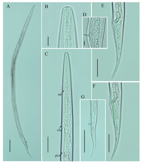 Photomicrographs of male Ditylenchus valveus Thorne and Malek [31] (A) Entire body; (B) lip region; (C) pharyngeal region; (D) spicule; (E–G) tail regions. Scale bars: (A,G) 50 μm; (C,E,F) 20 μm; (B,D) 5 μm. Arrows: (exp) secretory–excretory pore; (mb) median bulb; (ph.b) pharyngeal bulb.