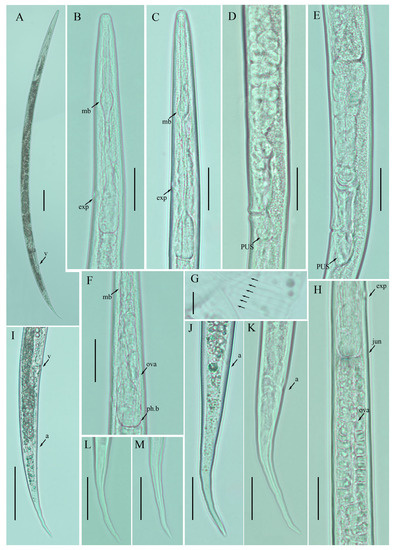 Photomicrographs of female Ditylenchus valveus Thorne and Malek [31] (A) Entire body; (B,C) pharyngeal region; (D,E) vulval regions; (F) posterior pharyngeal region; (G) lateral field lines; (H) post pharyngeal region showing reflexed ovary; (I) posterior body to tail terminus; (J,K) tail regions; (L,M) tail tips. Scale bars: (A,I) 50 μm; (B–F,H,J–M) 20 μm; (G) 5 μm. Arrows: (a) anus; (exp) secretory–excretory pore; (ph.b) pharyngeal bulb; (jun) pharyngeal intestinal junction; (mb) median bulb; (ova) ovary; (PUS) postvulval uterine sac; (v) vulva.
