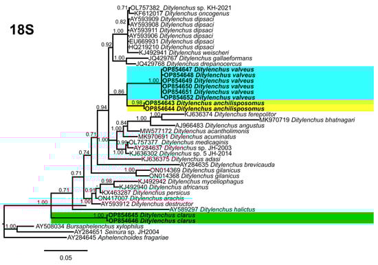 Phylogenetic trees based on the 18S, D2–D3 of 28S and ITS rDNA genes were constructed to study the phylogenetic relationships of the recovered species with the available Ditylenchus species. The 18S tree (alignment 1694 bp; Figure 8) was constructed with 39 Ditylenchus sequences and Bursaphelenchus xylophilus Steiner and Buhrer (Nickle [49,50]) (AY508034), Seinura sp. (AY284251) and Aphelenchoides fragariae (Ritzema Bos) Christie, [51,52] (AY284545) as outgroup taxa. In this tree, D. anchilisposomus and D. valveus form a separate, moderately supporting clade (PP = 0.86) among other Ditylenchus species, and D. clarus occupies a basal position as a separate, well-supported clade (PP = 1.00). The 28S tree (alignment 769 bp; Figure 9) was constructed with 38 Ditylenchus sequences with B. xylophilus (DQ364687) as an outgroup taxon. In this tree, D. clarus shares a branch with D. halictus Giblin-Davis, Erteld, Kanzaki, Ye, Zeng and Center [10], (AY589364) and D. nanus Siddiqi [53](MT582802) in a low support (PP = 77%), whereas D. anchilisposomus, D. tenuidens, and D. valveus grouped independently among other Ditylenchus species in well-supported clades (PP = 1.00). The ITS tree (alignment 786 bp: Figure 10) was constructed from 57 Ditylenchus sequences and B. xylophilus (KM657966, JQ743665) as an outgroup taxon. In the ITS tree, D. anchilisposomus, D. tenuidens and D. clarus clustered together in a well-supported clade (PP = 1.00), whereas D. valveus clustered in a separate low-supported clade (PP = 0.68), maintaining a middle position in the tree; however, all these species grouped independently among other Ditylenchus species.