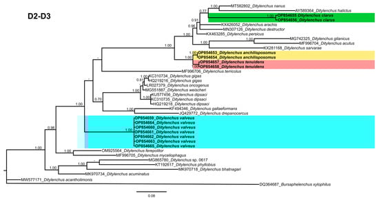 We molecularly characterized the Ditylenchus species recovered in our survey using the 18S, D2–D3 of 28S and ITS rDNA diagnostic genes. We deposited the obtained sequences into the NCBI database under the following accession numbers: D. anchilisposomus (partial 18S, OP854643–OP854644; D2–D3 of 28S, OP854653–OP854654; and ITS, OQ058851–OQ058852); D. clarus (partial 18S, OP854645–OP854646; D2–D3 of 28S, OP854655–OP854656; and ITS, OQ058853–OQ058854); D. tenuidens (D2–D3 of 28S, OP854657–OP854658; and ITS, OQ058855–OQ058856); and D. valveus (partial 18S, OP854647–OP854652; D2–D3 of 28S, OP854659–OP854665; and ITS, OQ058857–OQ058861).