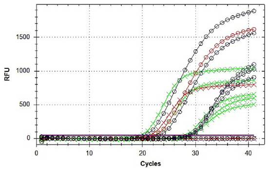 Duplex TaqMan real-time RT-PCR amplification plots for the detection of ToBRFV in five individual tomato plants. Black and green curves show amplification from symptomatic tomato samples. Red curves, positive (total nucleic acid extracted from infected tomato tissues) controls. Brown curves, negative (no template nucleic acid) controls. Black circle (O) and green cross (X) symbols indicate amplification curves with primer/probes CaTa28/FAM and CSP1325/ Cy5, respectively.