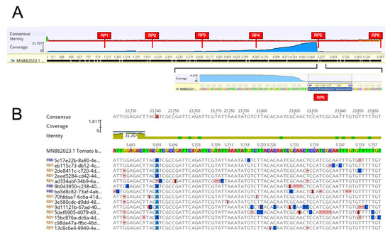 The MinION sequencing run of the greenhouse-infected tomato sample produced 40,114 reads mapping on the ToBRFV genome (Table 2), with an average coverage depth of 6840.46× and a mean length of 806 nt. Individual reads were subjected to BLASTn/BLASTx searches against GenBank sequences in order to exclude reassortants. The complete genome sequence consisted of 6392 nt. Figure 2A illustrates the mapping of ToBRFV-specific reads on the reference genome. Poor coverage was found for reads mapping at the first 12 nucleotides (nt) at viral RNA 5′-end (9 reads), and at the last 17 nt (6381–6397, 2 reads) at the 3′-end of the reference ToBRFV genome. The highest read coverage was reached in the region spanning approximately nt 4300–5180 in the viral genome. This peak of sequences is compatible with a highly active reverse transcription process primed by RP5, that is complementary to the ToBRFV RNA approximately at position 5200 (Figure 2A). Individual reads showed some degree of nucleotide sequence variability which may represent the intrinsic low accuracy of the nanopore sequencing technique. Despite this variation, an almost complete consensus of the viral genome could be assembled, that shared 99% identity at nucleotide level to ToBRFV isolates from Jordan (Tom1-Jo, acc. no. KT383474) and Israel (IL, KX619418). When considering the alignment, reads presented nucleotide changes compared to the reference sequence, that were consistently detected in the vast majority of the reads for each position. Figure 2B illustrates an example where many point sequence variations in individual reads within a genome segment do not hinder the construction of a consensus sequence. In the same example (Figure 2B), a real substitution G>A against the reference sequence at position 5691 is identifiable by the consistency (>90%) throughout all the sequenced reads. Similar sequence variations were also observed for the other two reconstructed genomes, ToMMV and PepMV (see below).