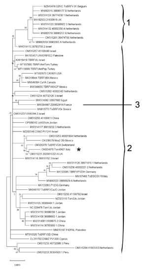 Maximum-likelihood phylogenetic tree by using the method with HKY+G model and 1000 replicates bootstrap value. The distribution of 56 ToBRFV isolates, based on their complete genome sequences, is shown. The asterisk marks the position in the tree of the Italian isolate ToBRFV-Tom-BA21 under study. The sequence of a different tobamovirus species, ToMMV-MX5 (GenBank acc. no. NC_022230), was used as the outgroup to root the tree MEGA X software (not shown in the figure). Numbering on the right side of the graph refers to the three ToBRFV phylogenetic groups as described by Çelik and coauthors [28].