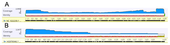 Once the viral genomes in each library were identified, mapping to the complete viral genome sequences used as the reference was run using Minimap2 aligner program [44]. The final consensus sequences were extracted from the alignment after mapping the corresponding reads to the closest reference viral genomes using Geneious Prime v. 2021.2 (Biomatters, San Diego, CA, USA).