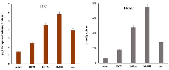 The TPC was the highest in the MeOH extract (5.81 ± 0.2 µg gallic acid (GA) equivalents/mg extract) and lowest in the n-Hexane extract (1.43 ± 0.23 µg GA equivalents)/mg extract) (Figure 2).