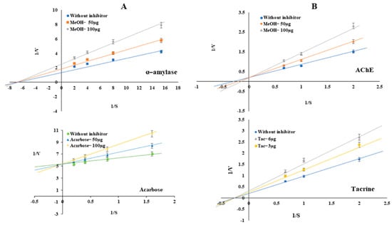 To find the mechanism of inhibition of α-amylase and AChE by the MeOH extract, we performed enzyme kinetics studies. The MeOH extract was found to be a noncompetitive inhibitor of α-amylase and a competitive inhibitor of AChE (Figure 4). On the contrary, the standard drugs, acarbose and tacrine, showed competitive and noncompetitive inhibition of α-amylase and AChE, respectively, which is in agreement with previous reports [32,39]. It is evident that plant extracts exhibit competitive and noncompetitive inhibition due to the presence of a variety of bioactive compounds [59]. A decrease in Vmax and no change in Km are characteristics that differentiate noncompetitive inhibition from competitive (no change in Vmax and an increase in Km) and uncompetitive (decrease in both Vmax and Km) inhibition [60].