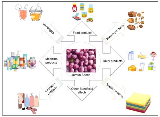 - Kumar, M.; Zhang, B.; Nishad, J.; Verma, A.; Sheri, V.; Dhumal, S.; Sharma, N.; Chandran, D.; Senapathy, M.; Dey, A. Jamun (Syzygium cumini (L.) Skeels) Seed: A Review on Nutritional Profile, Functional food properties, health-promoting applications, and safety aspects. Processes 2022, 10, 2169. [Google Scholar] [CrossRef]