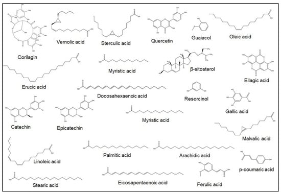 | Jamun seed extracts | Different natural habitats, India | Phenolic substances (µg/g plant material, dry weight) Gallic acid: 646 Quercetin: 98 Kaempferol: 59 Ellagic acid: 38 Caffeic acid, ferulic acid, and rutin: not shown AOA: 85.49 ± 0.8% TPC: 108.79 ± 1.0 mg/g | [28] |