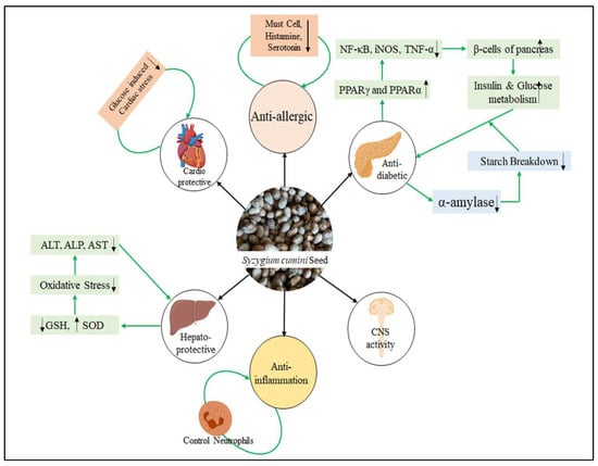 | Antidiabetic effect: glucose levels were reduced significantly and serum insulin levels also improved. Hypolipidemic effect: a reduction in total cholesterol, LDL-c, and serum triglyceride, and increased serum HDL-c were observed. Hepatoprotective activity: the extract treatment did not show any statistically significant reduction in serum creatinine and serum urea. However, the protein concentration increased significantly, even more than that of the rats treated with the gliclazide, and a reduction in the ALT, AST, ALP, and bilirubin levels was observed. A liver section revealed normal hepatic tissue. | Wistar albino rats of either sex (230–250 g), 8–10 weeks of age with diabetes (Alloxan: 150 mg/kg). | 14 days; 5 groups (n = 6): (1) control—only vehicle; (2) diabetic control—only vehicle; (3) diabetic + methanolic extract of S. cumini seeds (100 mg/kg, p.o.); (4) diabetic + methanolic extract of S. cumini seeds (200 mg/kg, p.o.); (5) diabetic + gliclazide (25 mg/kg, p.o.). | [36] |
