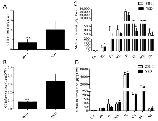 Cd content in YSD straw and grain was significantly higher than that in ZH11. Determination of Cd and other metal elements in YSD and ZH11 straw (A,C) and brown rice (B,D) at ripening stage grow in 0.4 mg/kg Cd-contaminated field. Data are presented as the means (±SD), n = 5. Significant differences were determined using the Student’s t-test: * p < 0.05, ** p < 0.01.
