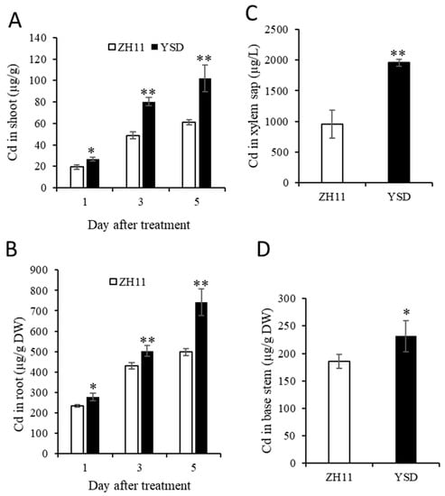 Time-dependent higher Cd accumulation in shoots and roots of YSD than ZH11. After 4 weeks of hydroponics, rice seedlings were treated with 10 μM Cd for 1, 3, and 5 days, Cd content in the shoot (A), root (B), basal stem (C) and xylem sap (D) were determined by ICP-MS. Data are presented as the means (±SD), n = 5. Significant differences were determined using the Student’s t-test: * p < 0.05, ** p < 0.01.
