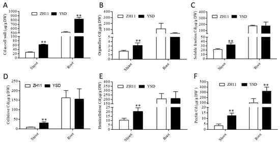 Cd content in different subcellular and cell wall components of YSD and ZH11. After 4 weeks of hydroponics, rice seedlings were treated with 10 μM Cd for 3 days, Cd content in cell wall (A), organelles (B), soluble part (C), cellulose (D), hemicellulose (E), and pectin (F) of the shoot and root were determined by ICP-MS. Data are presented as the means (±SD), n = 3. Significant differences were determined using the Student’s t-test: ** p < 0.01.