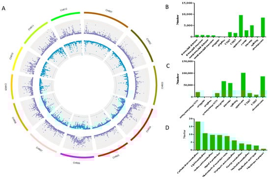 Genome-level variation of YSD compared to ZH11. Fresh leaves of 10-day-old plants were sampled for isolation of genomic DNA (gDNA) to perform whole-genome resequencing. (A) Genome variation Circos diagram. Circle 1: The chromosome; Circle 2: The purple locus represents the distribution of SNP density in the genome; Circle 3: Blue sites represent fractions of genomic InDel density. (B) Statistical map of SNP annotation results at gene level. (C) Map of InDel annotation results at gene level, and (D) pathway analysis of mutated gene loci.