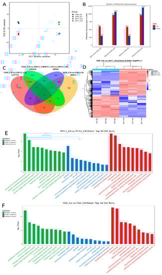 Analysis of transcriptome data from YSD and ZH11 roots. After 4 weeks of hydroponics, rice seedlings were treated with 0, 10 μM Cd for 3 days, and roots were taken for RNA_seq analysis. (A) Principal component analysis. (B) Number of up_ and down_regulated differentially expressed genes. (C) Venn diagram analysis of differentially expressed genes, (D) Heat map of differentially expressed genes. (E) GO annotation of differentially expressed genes in response to Cd stress in the roots of ZH11. (F) GO annotation of differentially expressed genes in response to Cd stress in the roots of YSD.