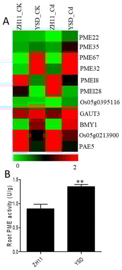 Differentially expressed genes (DEGs) involved in cell wall pectin metabolism and PME activity between YSD and ZH11 root under Cd treatments. (A) Transcriptional profiling of pectin methylesterase (PME 22/PME35/PME67/PME32), pectin methylesterase inhibitor protein (PMEI8/PMEI28), pectate lyase (Os05g0213900/PAE5) and pectin biosynthesis (CAUT3/BMY1). (B) PME activity in leaves of 30-day-old rice treated with 10 μM CdCl2 for 3 days. Data are presented as the means of 3 independent biological replicates (n = 3) and vertical bars represent the SD., ** indicates significant differences between the cultivars at p < 0.01.