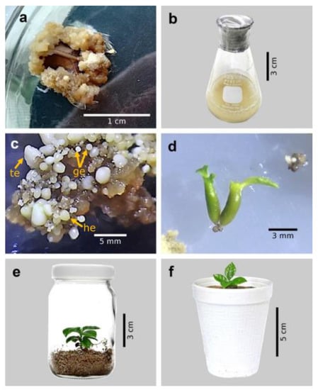 Somatic embryogenesis in coffee (Coffea arabica L. var. Colombia). (a) Embryogenic callus from leaf explants after eight weeks. (b) Embryogenic callus production in liquid medium after 12 weeks. (c) Somatic embryos in different stages of development after 150 d of culture differentiation medium. (d) Cotyledonary embryos after four weeks of culture on maturation medium. (e) In vitro plant grown in vermiculite:perlite mixture (3:1). (f) In vitro regenerated plant grown under greenhouse conditions. ge: globular, he: heart, te: torpedo.