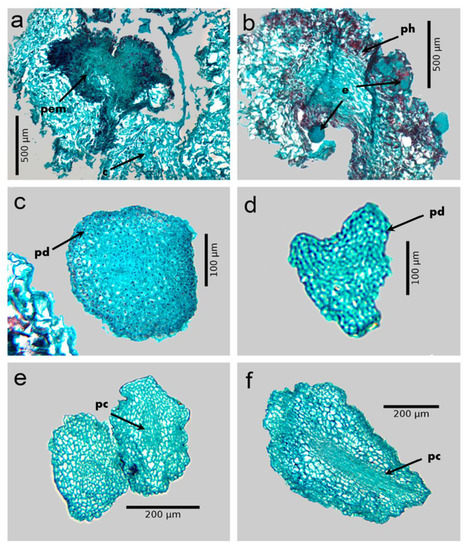 After 30 days of culture in the callus induction medium, the explants began to form calluses in the periphery and mainly in the midrib (Figure 2a). The callus was basically made up of large parenchyma cells, with vacuoles, sparsely evident nuclei, and abundant intercellular spaces. During the following 30 d, the callus cells underwent continuous divisions that allowed their biomass to increase. Then, the primary calli were transferred to the embryo differentiation medium, and small cells began to form on their surface, with dense cytoplasm, evident nuclei, and few intercellular spaces, similar to meristematic cells, which showed a certain degree of organization (proembryogenic masses). The proembryogenic masses formed began to accumulate phenolic compounds in high concentration, after 30 d of culture on the differentiation medium; the presence of said compounds caused the darkening of said masses (Figure 2a) and only those that produced phenols managed to form embryos. At 120 d of culture in the differentiation medium, embryos in the globular stage were formed from the proembryogenic masses (Figure 2b); these embryos showed a protodermis that covered the periphery of the embryo and that was made up of a series of small cells with an evident nucleus (Figure 2c). When the globular and heart embryos (Figure 2c,d) were cultured in the maturation medium, they reached the torpedo (Figure 2e,f) and cotyledonary stage after 30 and 45 d, respectively. In the torpedo and cotyledonary stage embryos, it was possible to observe a group of elongated cells with visible nuclei that were distributed throughout the embryo and that constituted the vascular procambium zone (Figure 2f).