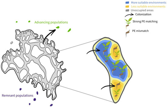 Most plant species’ geographic ranges consist of a number of differently sized, spatially structured populations connected by varying rates of dispersal (metapopulation) [48,49,50] in areas with a range of environmental suitability (Figure 1), with the potential for source–sink population dynamics [51,52]. For example, many glacial remnant populations of tree species remaining in microclimate refugia may be becoming PE-mismatched sink populations with low fecundity and survival, which persist largely because of seed subsidies from source populations and the storage effect of long lifespans and vegetative propagation [53,54,55,56]. On the other hand, propagules may disperse from the range center, seeding populations at advancing range edges that, if they establish, would cause range shift or expansion.
