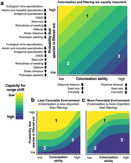 A plant species’ capacity for range shifts is shaped by the relationship between its colonization ability and its probability of being filtered out of a site. The capacity for plant range shifts is determined equally by the effects of colonization ability and the probability that a species experiences habitat filtering (i.e., is filtered out of a site) after colonization in (a), is more limited by a species’ probability of being filtered out in (b), and is more limited by a species’ colonization ability in (c), with low (yellow) to high (purple) capacity for range shift. Trade-offs in species’ ecological strategies influence their colonization ability and their probability of being filtered out of a site through a phenotype–environment mismatch. Trait values that should increase or decrease colonization ability or probability of being filtered out are denoted on the high and low ends of each axis and apply to all three graphs, even though they are only detailed in (a). The numbers 1, 2, and 3 represent the positions of three hypothetical species positioned on the x and y axis coordinates based on their trait values. Species 1 would have a moderate dispersal distance and fecundity and small to moderately sized seeds; Species 1 could represent an abiotic condition and mutualist specialist and antagonist generalist, experience high pressure from conspecific negative density-dependence (CNDD), produce less robust seedlings, be a less well-defended and stress tolerant individual, and/or exhibit low phenotypic plasticity. Species 2 would have low seed dispersal distance and low fecundity and would be a large-seeded species; Species 2 could represent an abiotic condition and mutualist generalist and antagonist specialist, experience minimal effects of CNDD, produce more robust seedlings, be a well-defended and stress tolerant individual, and/or exhibit high phenotypic plasticity. Species 3 would have high colonization ability, due to having a longer dispersal distance, smaller seed size, and higher fecundity, and similar traits on the y-axis as Species 2. In (a), colonization ability and the probability of being filtering out are assumed to be equally important in determining the capacity for range shift (i.e., additive effects), leading to linear contours in plant range shift capacity. In this scenario, Species 1 has a low–moderate capacity for range shift because it has a moderate colonization ability but high probability of being filtered out; Species 2 has a moderate capacity for range shift, due to its low colonization ability and low probability of being filtered out; and Species 3 has a high capacity for range shift, due to a high colonization ability and relatively low probability of being filtered out. Both (b,c) represent environments where there are interactive effects between colonization ability and the probability of being filtered out, leading to curved contours. In (b), the environment is weighted by the probability of being filtered out, making it a stronger limiting factor than colonization ability on capacity for range shift, resulting in concave-up contours in plant range shift capacity. In this scenario, Species 1 will be unlikely to expand its range, while Species 2 and 3 should both be able to expand their ranges. In (c), the environment is weighted by colonization ability, making it a stronger limiting factor than the probability of being filtered out on the capacity for range shift, resulting in concave-down contours in plant range shift capacity. In this scenario, compared to (b), Species 1 has a better capacity for range shift, because the environment is more favorable, and Species 2 and 3 both have high capacities for range shift despite strong differences in colonization ability. There will not be any species located in the top left-most corner of the graphs with very low colonization ability and very high probability of being filtered out, as species with this strategy would have a very low capacity for range shifts and would not survive in their current distributions. Similarly, there should be relatively fewer species in the top right-most corner of the graphs that have high colonization ability and high probability of being filtered out, as species with these strategies would face challenges in establishing a viable population (due to high filtering) and would have below-moderate capacity for range shifts. See Table 1 and Section 6 text for further explication of trade-offs in species’ ecological strategies, and how these operate to increase or decrease the capacity of a species to shift its habitat and/or geographic range.