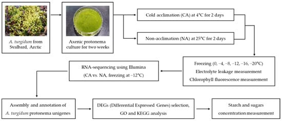 In the present study, we prepared two groups of axenic protonema of A. turgidum, with and without cold acclimation. After freezing stress treatment, we aimed to investigate transcriptome changes that mediate the cold acclimation process. To this end, we obtained Illumina technology-based RNA sequence data and created a transcriptome reference for A. turgidum through de novo assembly. Differentially expressed genes were selected from the cold acclimation treatment sample, and information about their biological functions was provided. Finally, we measured the concentration of starch and sugars to determine whether cold acclimation affects carbohydrate metabolism. The overall process for this study is summarized in Figure 1.