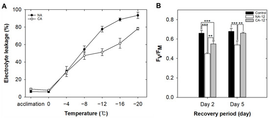 As electrolyte leakage (EL) is considered a good indicator of cell membrane integrity [], we performed an electrolyte leakage assay to compare membrane integrity and freezing sensitivity of A. turgidum protonema with cold acclimation (CA) and without (non-acclimation; NA). The protonema of A. turgidum cultured at 25 °C for two weeks was transferred to a fresh BCDAT agar plate and acclimated at 4 °C (CA) and 25 °C (NA) under continuous light for 48 h. Then, changes in EL of protonema of A. turgidum at different sub-zero temperatures (0 to −20 °C) were examined. When the 50% electrolyte leakage (EL50) of the NA and CA were compared, the temperature of CA EL50 (−10.6 °C) was 3.3 °C lower than the temperature of NA EL50 (−7.3 °C). Furthermore, the greatest difference in EL of CA and NA was observed at −12 °C (Figure 2A).