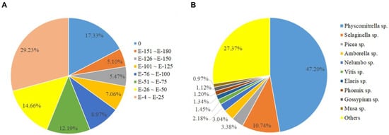 Functional annotation of each unigene was obtained by BLASTx against the non-redundant protein database (Nr). The similarity analysis of the Nr database revealed that 56.12% of unigenes had a significant homology (E-value < 1 × 10−50) (Figure 3). The Nr annotation species distribution analysis revealed that a majority of A. turgidum unigenes had a significant match to Physcomitrella sp. (47.20%), followed by Selaginella sp. (10.74%), Picea sp. (3.38%), Amborella sp. (3.04%), Nelumbo sp. (2.18%), Vitis sp. (1.45%), Elaeis sp. (1.34%), Phoenix sp. (1.20%), Gossypium sp. (1.12%), Musa sp. (0.97%), and others (27.37%). Because of research into A. turgidum has been rarely carried out. Only three (0.0040%) unigenes were annotated in the Nr database against A. turgidum (Figure 3, Table S1).
