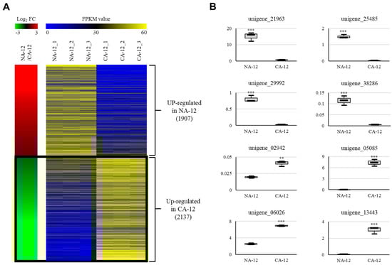 Heatmap of differentially expressed unigenes of CA-12 compared to NA-12. Using RNA-seq data analysis under the criteria of p-value < 0.05 and a log2 ratio of <−1 or >1 of NA-12 versus CA-12, we identified 4044 differentially expressed unigenes (A). In the left panel, red indicates upregulation in NA-12; green indicates upregulation in CA-12. The right panel shows average normalized FPKM values from RNA-seq experiments; blue indicates the lowest expression level, and yellow is the highest. Detailed data from the RNA-seq analysis are presented in Table S4. The association with the heatmap was further confirmed by monitoring eight genes using qPCR (B). The y-axis indicates the expression level relative to EF1/unigene_08701 (internal control), and the x axis indicates samples used for qPCR. Data are means ± SD of three repeats (***, p < 0.001; **, p < 0.01, Student t-test). The primer sequences used for qPCR analysis are shown in Table S5. CA-12, A. turgidum protonema were cold-acclimated at 4 °C for 2 days and exposed to freezing until −12 °C; NA-12, A. turgidum protonema were non-acclimated at 25 °C for 2 days and exposed to freezing until −12 °C.