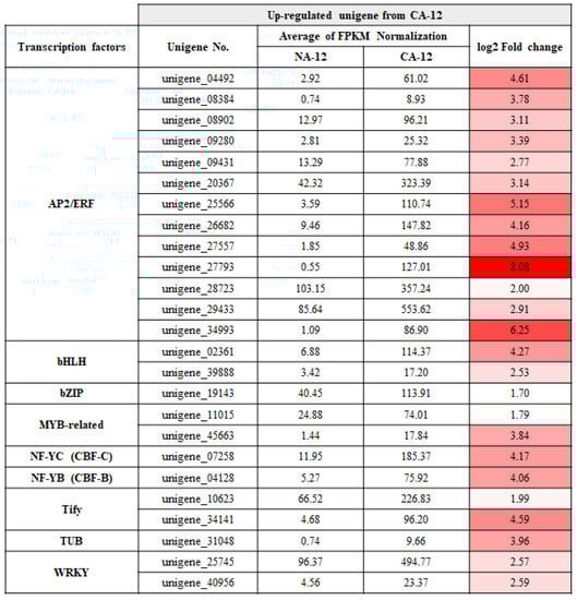 List of up-regulated unigenes encoding transcription factors in the CA-12 treatment. The average FPKM normalization and log2 fold change values for the identified 25 unigenes are described. In the log2 fold change column, red indicates the highest value, and white indicates the lowest value. CA-12, A. turgidum protonema were cold-acclimated at 4 °C for 2 days and exposed to freezing until −12 °C; NA-12, A. turgidum protonema were non-acclimated at 25 °C for 2 days and exposed to freezing until −12 °C.
