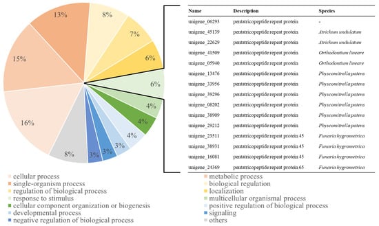 Gene ontology (GO) analysis in the “biological processes” category for unigenes upregulated in response to CA-12 treatment. Thirteen GO terms were over-represented, with the rest collectively indicated as “others”. In the circle graph, the percentage occupied by each GO term is expressed as “%”. Fifteen unigenes encoding pentatricopeptide repeat (PPR) protein were identified in “response to stimulus” (6%), which is a distinguished feature for A. turgidum. Details of GO information for groups upregulated in CA-12 treatment are presented in Table S6.
