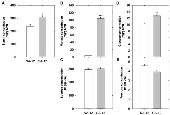 To determine if cold acclimation affects carbohydrate metabolism, we measured the starch concentrations and detected a higher starch content in CA-12 than in NA-12 (Figure 7A). In addition, concentrations of maltose, sucrose, glucose, and fructose were measured using HPLC. The content of maltose and glucose in CA-12 was significantly higher than that of NA-12. However, the fructose content was lower in CA-12, and there was no significant difference in sucrose between NA-12 and CA-12 (Figure 7B–E). These results suggest that cold acclimation in A. turgidum increases tolerance to freezing stress through the accumulation of starch, maltose, and glucose.