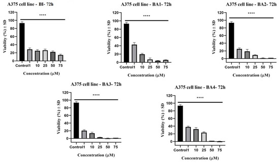 Viability of A375 human melanoma cells following 72 h stimulation with BI, BA1, BA2, BA3, and BA4 at concentrations of 1, 10, 25, 50, and 75 µM. The study results are reported as a percentage (%) of cell viability in comparison to the control cells. One-way ANOVA followed by Dunnett’s multiple comparison post-test was used to compare the groups. A p-value ≤ 0.05 was regarded as statistically significant (**** p ≤ 0.0001 vs. control).