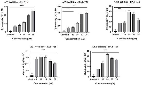 The cytotoxic activity of BI, BA1, BA2, BA3, and BA4 at concentrations of 1, 10, 25, 50, and 75 µM on A375 cells after 72 h of incubation. The data are presented as a cytotoxicity percentage (%) ± SD compared to control cells. A one-way ANOVA test and Dunnett’s multiple comparison post-test were used to compare the groups (*** p ≤ 0.001; **** p ≤ 0.0001 vs. control).