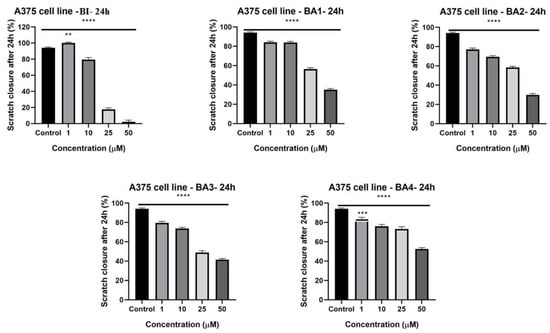 Images depicting the migratory potential of A375 cells after treatment with BI, BA1, BA2, BA3, and BA4 for 24 h. The bar graphs show the percentage of wound closure relative to the baseline surface after 24 h. The results are shown as the mean values ± SD of three separate trials carried out in triplicate. Applying the one-way ANOVA analysis and then Dunnett’s multiple comparisons post-test (** p ≤ 0.01; *** p ≤ 0.001; **** p ≤ 0.0001 vs. control) were used to determine the significant differences between the control and treated groups.