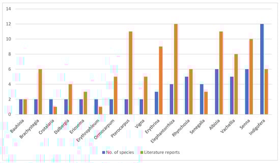 Indigofera is the genus with the highest number of medicinal Fabaceae species (12 species), followed by Senna (six species), and Albizia, Rhynchosia and Vachellia with five species each (Figure 2). However, the genera associated with the highest number of records in the literature are Elephantorrhiza (12 records), Pterocarpus (11 records), Senna (10 records), Albizia and Erythrina (nine records each) and Vachellia with eight records (Figure 2). The number of medicinal species found in each genus is significantly correlated to the total number of species in each genus in Zimbabwe (p < 0.01, r = 0.772). These results are consistent with those observed by Anorld et al. [49], who recorded 11 medicinal species of Albizia, followed by Rhynchosia (12 species), Senna (17 species), and Indigofera and Vachellia with 32 species each. In Botswana, Hedberg and Staugård [50] argued that one Senna species, followed by Albizia (three species), Rhynchosia (four species), Indigofera (five species) and Vachellia (six species) were used as traditional medicines in that country. Moreover, several species of Albizia, Elephantorrhiza, Erythrina, Senna and Vachellia are included in the monograph Medicinal Plants of South Africa, with detailed information on their botany, medicinal uses, preparation, dosage, active ingredients and pharmacological effects [51].