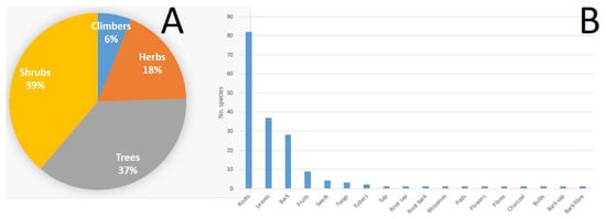 Characteristics of Fabaceae species used as traditional medicines in Zimbabwe. (A): Growth habit as a pie diagram and (B): Plant parts used presented as a bar chart.