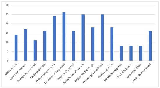Fifteen medicinal species are known to have more than eight usage reports (Figure 4). These species included Albizia amara, Albizia antunesiana, Brachystegia boehmii, Cassia abbreviate, Dichrostachys cinerea, Elephantorrhiza goetzei, Erythrina abyssinica, Peltophorum africanum, Piliostigma thonningii, Pterocarpus angolensis, Schotia brachypetala, Senna singueana, Vachellia karroo, Vigna unguiculata and Xeroderris stuhlmannii. Some of these plant species are widely used as sources of traditional medicines in Angola [63], Botswana [50,64], Eswatini [65], Malawi [66,67], Mozambique [58,68], Namibia [69,70], South Africa [71,72] and Zambia [73,74]. The importance of these species as sources of traditional medicines is documented in the monographs Medicinal and Magical Plants of Southern Africa: An Annotated Checklist [49], Plant Resources of Tropical Africa 11: Medicinal Plants 1 and 2 [75,76] and Medicinal Plants of South Africa [51]. Research by Van Wyk [77] revealed that Colophospermum mopane, Dichrostachys cinerea and Vachellia karroo are commercially exploited in local, regional or international trade in eastern, southern and western Africa.