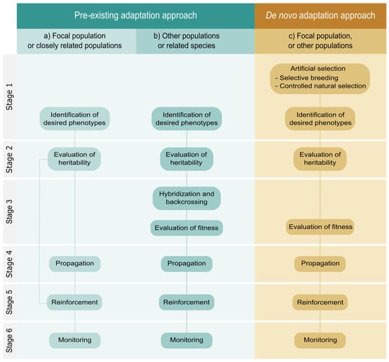 Stage 2: Check the heritability of the desired traits. Once the individuals with the desired traits have been identified, it is necessary to assess the narrow-sense heritability of such traits (i.e., the ratio of additive variance over phenotypic variance). Different approaches can be taken to measure the narrow-sense heritability depending on the type of data that can be obtained, whether the data are gathered in experimental settings using common garden experiments or in natural settings, and the generation time of the species (see Falconer and Mackay [97] for details). When the generation time of the species is high, it may be more efficient timewise to use estimations based on sibling analysis, where the phenotypic resemblance among relatives versus non-relatives is measured in a single generation. Otherwise, different approaches involving phenotypic measurements of parents and offspring or different individuals of known relatedness over two or more generations can be used [98]. Depending on the type of data gathered, parent–offspring regression, full-sib/half-sib analysis and the animal model can be applied. The latter provides the most accurate estimations of heritability as it consists of a mixed model that can account for various other sources of resemblance such as maternal and common environment effects [99]. If heritability were low, the feasibility of this approach is compromised. In such case, the de novo adaptation approach could be considered as an alternative to increase heritability.