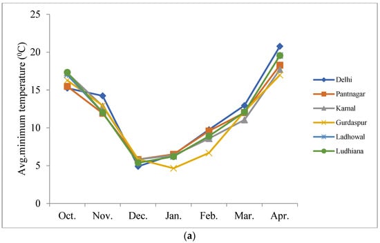 All the study locations had sandy loam soil except Pantnagar, that had loamy soil. The soil organic carbon varied from 0.37–0.42%, Soil pH from 7.5–8, and EC from 0.25–0.4 dsm−1 across the study locations. The avg. minimum temperature (Figure 3a), avg. maximum temperature (Figure 3b), and rainfall (mm) (Figure 3c) recorded for each month during the cropping period in all locations are reported. The temperature trend remains the same across locations and the highest rainfall was recorded at Gurdaspur.