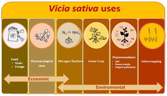 V. sativa main uses. The scheme includes economically relevant nutritional and medical uses. Environmental applications for sustainable agriculture systems are also incorporated.