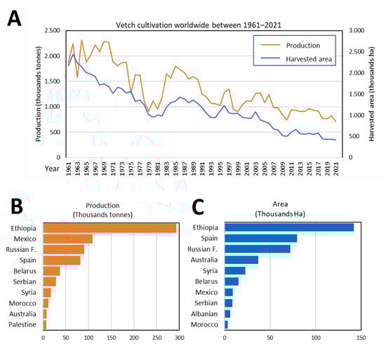 Worldwide V. sativa cultivation. (A) Production data and cultivated area of vetch worldwide during the last 60 years. Main producers according to cultivated area (B) or production (C) during the year 2021.