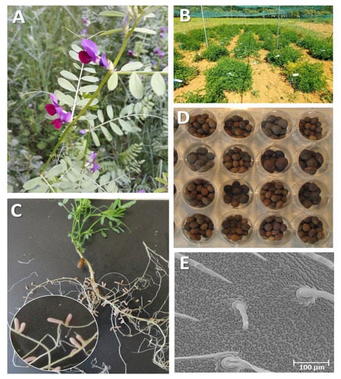 V. sativa plants showing different tissues and growing stages. (A) Wild-growing common vetch at “Sierra Norte”-Madrid (Spain). (B) Field evaluation assay of different accessions (CRF-INIA/CSIC gene bank). (C) Indeterminate Rhizobium nodules of a common vetch root. (D) Diversity of size, shape, and color observed in seeds from different accessions from a CRF core collection. (E) Abaxial leaf surface, showing trichomes, stomas, and epidermal cells.