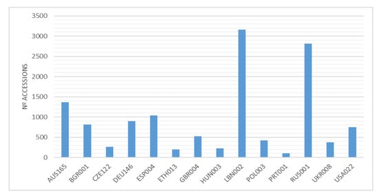 Main collection of Vicia sativa accessions, by holding institution, reported at GENESYS. The holding institutions are identified by their WIEWS code, available at https://www.fao.org/wiews/data/organizations/en; (accessed on 15 February 2023).