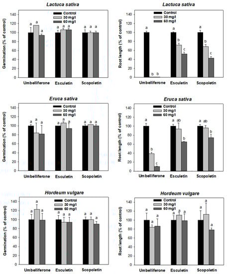 Effect of umbelliferone, esculetin, and scopoletin at concentrations of 30 and 60 mg/L on germination (left) and root growth (right) of L. sativa, E. sativa, and H. vulgare under Petri dish conditions (t = 6 days). Different letters above the bars indicate statistically significant differences between treatments.